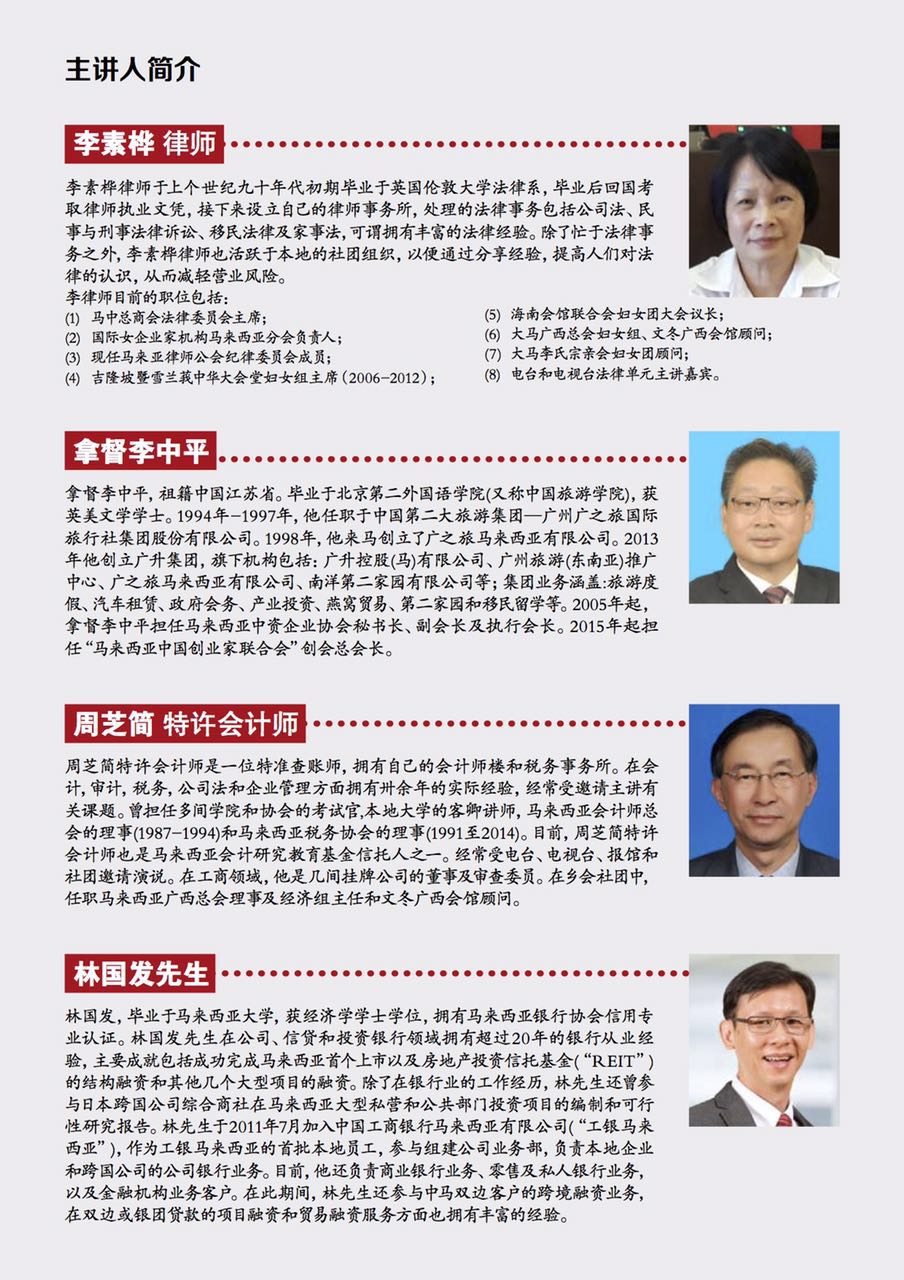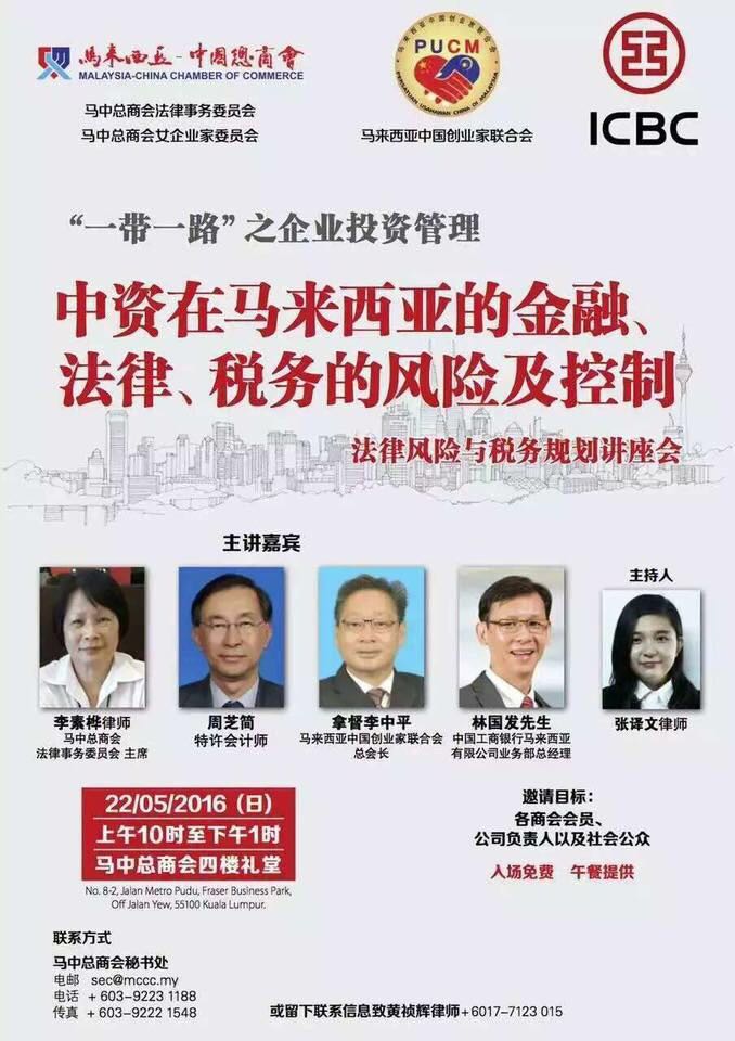马中总商会与马来西亚中国创业家联合会将于本月22日(星期日)联合举办"一带一路,企业投资管理(法律风险与税务规则)"讲座会。
