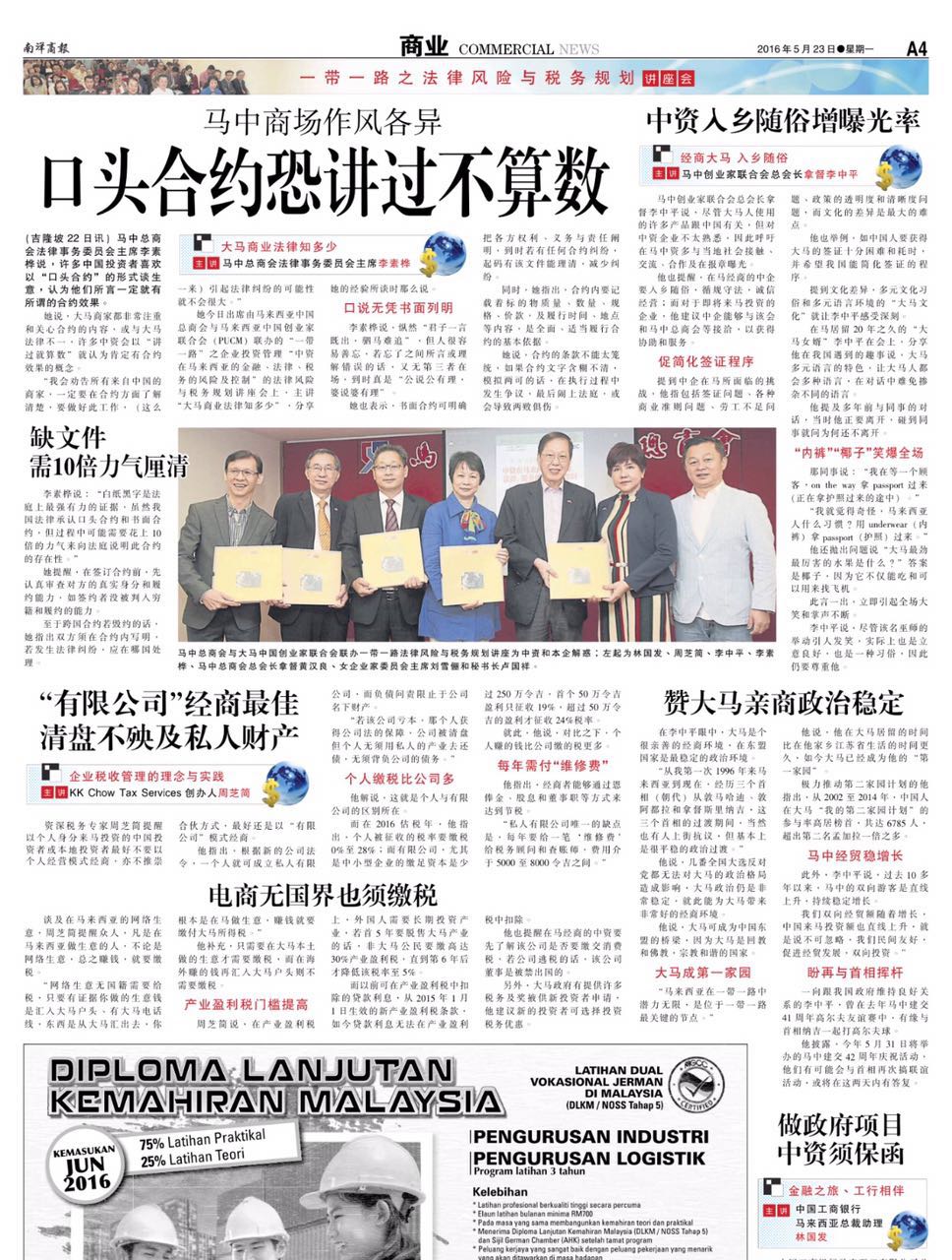 5月22日,由马来西亚中国创业家联合会 (PUCM )和马中总商会(MCCC)联合主办的"一带一路"之企业投资管理:中资在马来西亚的金融、法律、税务的风险及控制讲座会取得圆满成功。