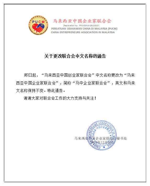 关于更改联合会中文名称的通告